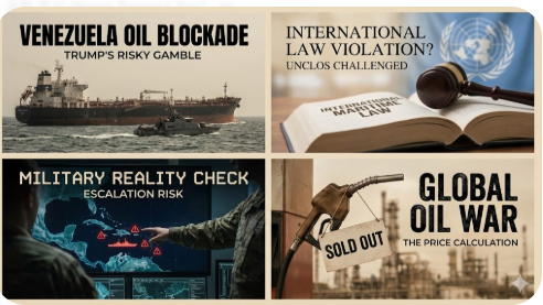 핵심 포인트는 “전면 봉쇄”의 대상이 ‘베네수엘라 전체 해상교통’이 아니라, “제재(sanctioned) 유조선”으로 특정돼 있다는 점이다. 이 프레이밍은 매우 정치적으로 영리한데, 완전한 해상봉쇄처럼 보이지만, 표면상으로는 제재집행 강화(법집행)처럼 포장할 여지가 생기나 국제법과 현실정치는 그렇게 단순하게 흘러가지 않는다.