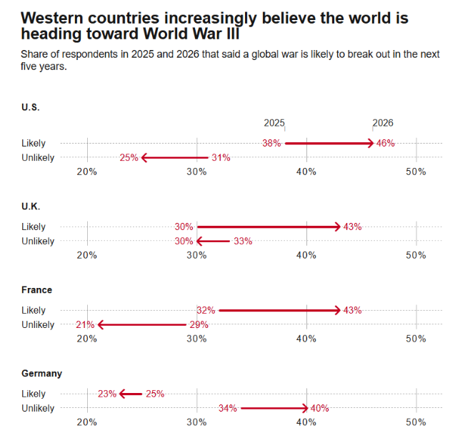 전 세계적으로 안보 위기가 고조되면서 서구 주요국 시민들 사이에서 제3차 세계대전이 일어날 수 있다는 공포가 확산되고 있다.