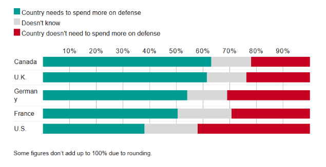 프랑스와 독일의 경우, 지난해에는 구체적인 대가가 따르더라도 국방비 증액을 지지한다는 여론이 각각 40%, 37%였으나 올해는 28%, 24%로 급감했다.